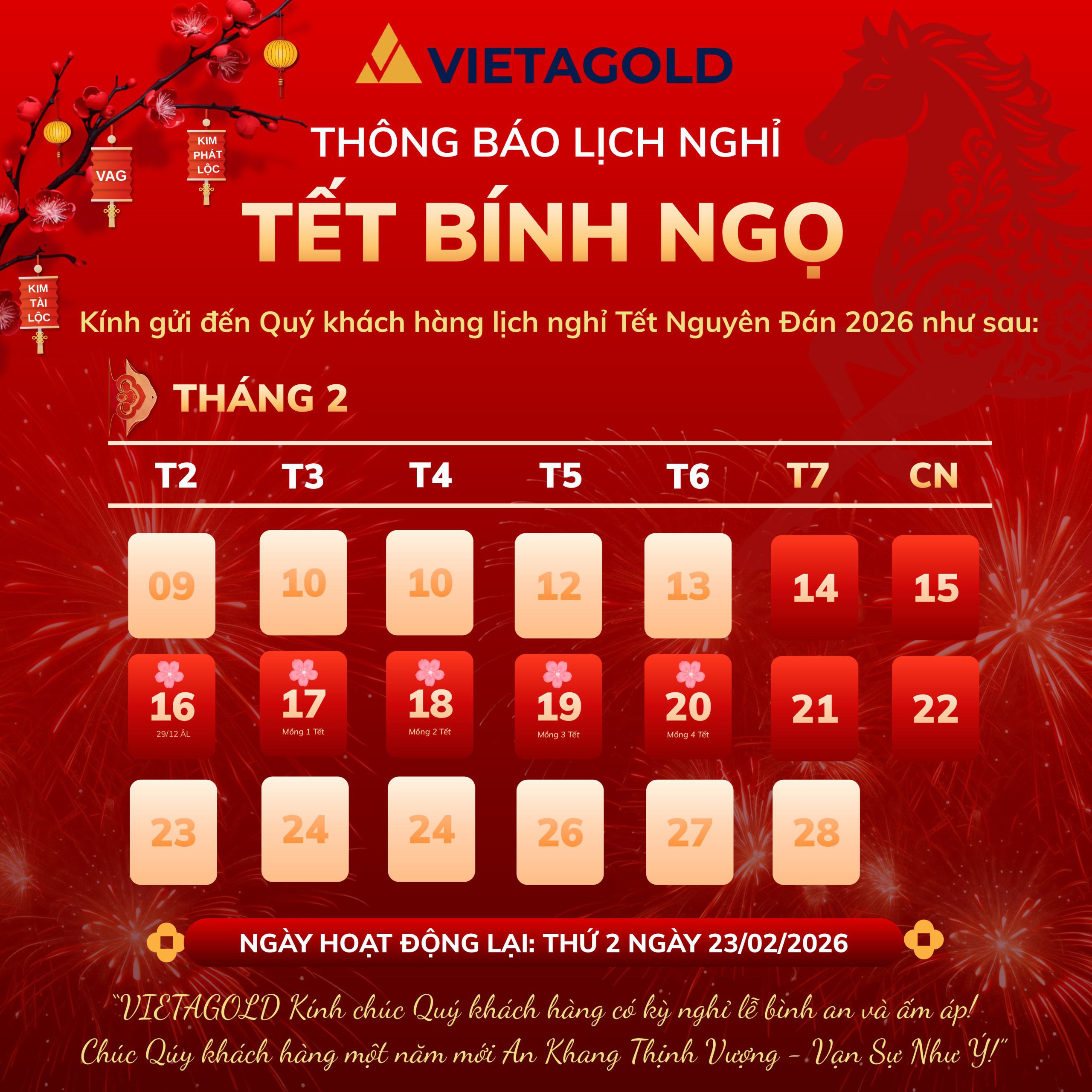 VIETAGOLD trân trọng thông báo lịch nghỉ lễ Tết Nguyên Đán 2026 như sau: